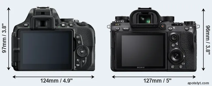 The physical size and weight of the Nikon D5600 and the Sony A9 are illustrated in the side-by-side display below. The two cameras are presented according to their relative size. Three successive views from the front, the top, and the rear are shown. All size dimensions are rounded to the nearest millimeter.