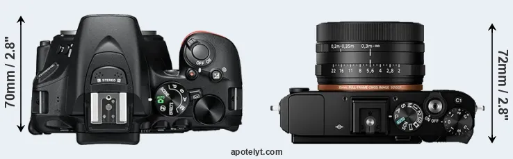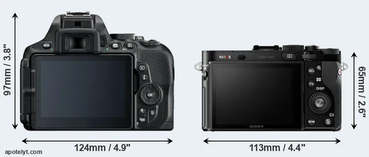 The side-by-side display below illustrates the physical size and weight of the Nikon D5600 and the Sony RX1R II. The two cameras are presented according to their relative size. Three consecutive views from the front, the top, and the rear side are shown. All width, height and depth dimensions are rounded to the nearest millimeter.