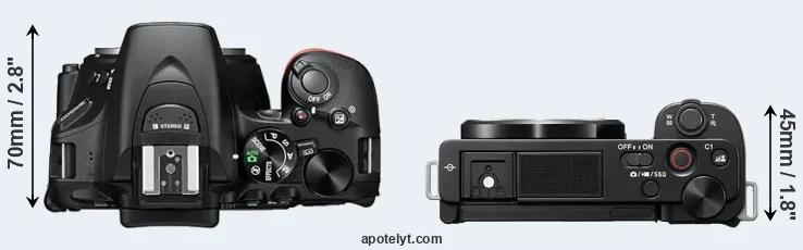 The side-by-side display below illustrates the physical size and weight of the Nikon D5600 and the Sony ZV-E10. The two cameras are presented according to their relative size. Three consecutive views from the front, the top, and the rear side are shown. All width, height and depth dimensions are rounded to the nearest millimeter.