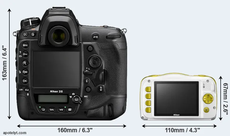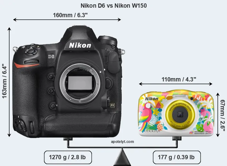 The physical size and weight of the Nikon D6 and the Nikon W150 are illustrated in the side-by-side display below. The two cameras are presented according to their relative size. Three successive views from the front, the top, and the rear are shown. All width, height and depth dimensions are rounded to the nearest millimeter.