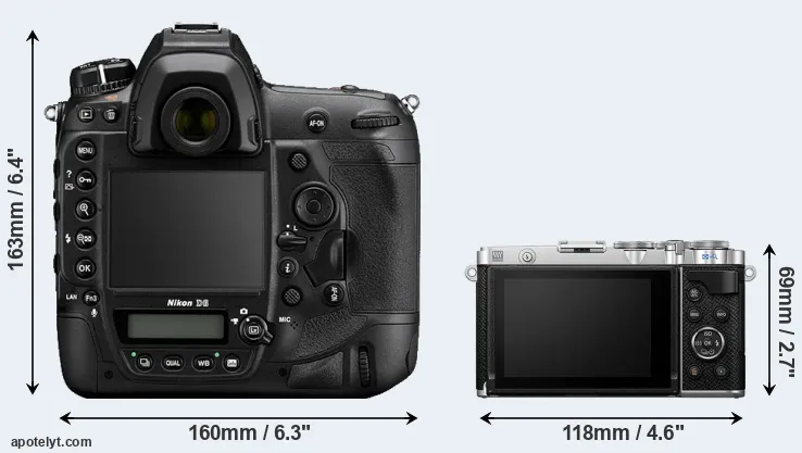 The physical size and weight of the Nikon D6 and the Olympus E-P7 are illustrated in the side-by-side display below. The two cameras are presented according to their relative size. Three consecutive perspectives from the front, the top, and the back are available. All width, height and depth dimensions are rounded to the nearest millimeter.
