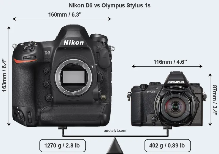 An illustration of the physical size and weight of the Nikon D6 and the Olympus Stylus 1s is provided in the side-by-side display below. The two cameras are presented according to their relative size. Three consecutive perspectives from the front, the top, and the back are available. All width, height and depth measures are rounded to the nearest millimeter.