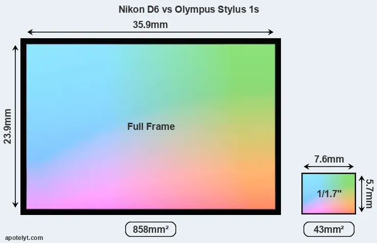 Of the two cameras under consideration, the Nikon D6 features a full frame sensor and the Olympus Stylus 1s a 1/1.7-inch sensor. The sensor area in the Stylus 1s is 95 percent smaller. As a result of these sensor size differences, the cameras have a format factor of, respectively, 1.0 and 4.5. The sensor in the D6 has a native 3:2 aspect ratio, while the one in the Stylus 1s offers a 4:3 aspect.