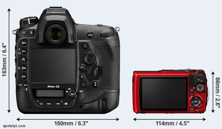 An illustration of the physical size and weight of the Nikon D6 and the OM System TG-7 is provided in the side-by-side display below. The two cameras are presented according to their relative size. Three successive views from the front, the top, and the rear are shown. All width, height and depth dimensions are rounded to the nearest millimeter.