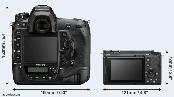 The side-by-side display below illustrates the physical size and weight of the Nikon D6 and the Sony ZV-E1. The two cameras are presented according to their relative size. Three consecutive views from the front, the top, and the rear side are shown. All width, height and depth measures are rounded to the nearest millimeter.