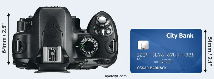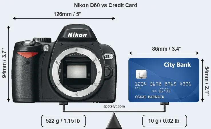 The physical dimensions of the Nikon D60 relative to a credit card are illustrated in the side-by-side display below. Three successive views from the front, the top, and the rear are shown. All size dimensions are rounded to the nearest millimeter.