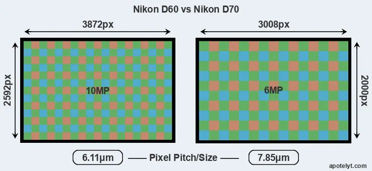 With 10MP, the D60 offers a higher resolution than the D70 (6MP), but the D60 has smaller individual pixels (pixel pitch of 6.11μm versus 7.85μm for the D70). However, the D60 is a much more recent model (by 4 years) than the D70, and its sensor will have benefitted from technological advances during this time that enhance the light gathering capacity of its pixels.