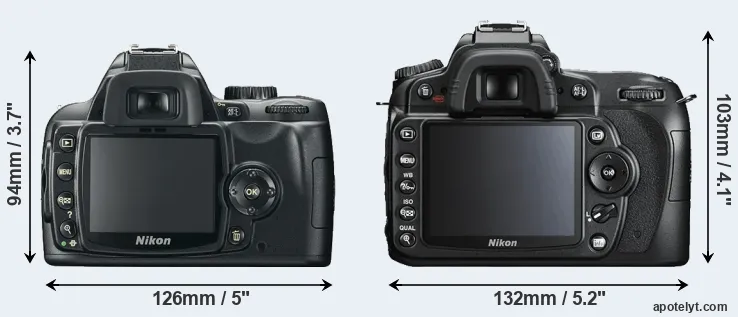The side-by-side display below illustrates the physical size and weight of the Nikon D60 and the Nikon D90. The two cameras are presented according to their relative size. Three successive views from the front, the top, and the rear are shown. All width, height and depth measures are rounded to the nearest millimeter.