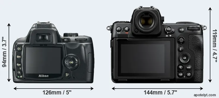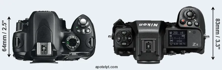 The physical size and weight of the Nikon D60 and the Nikon Z8 are illustrated in the side-by-side display below. The two cameras are presented according to their relative size. Three consecutive perspectives from the front, the top, and the back are available. All width, height and depth dimensions are rounded to the nearest millimeter.