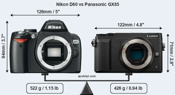 An illustration of the physical size and weight of the Nikon D60 and the Panasonic GX85 is provided in the side-by-side display below. The two cameras are presented according to their relative size. Three consecutive views from the front, the top, and the rear side are shown. All width, height and depth measures are rounded to the nearest millimeter.