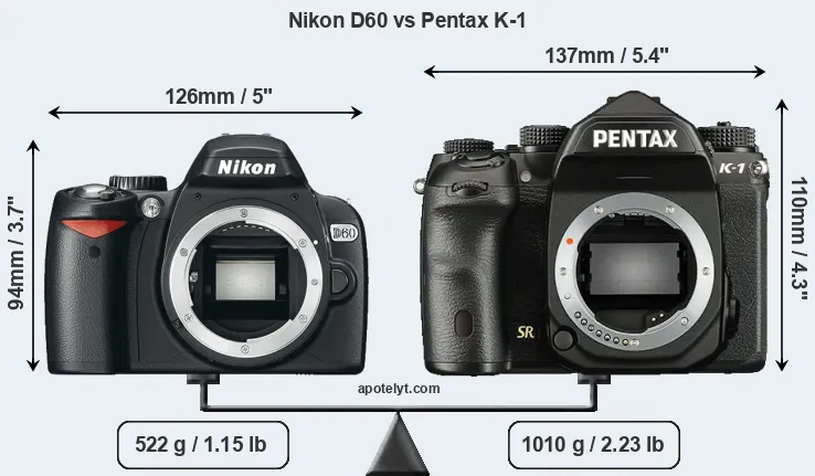 If the front view area (width x height) of the cameras is taken as an aggregate measure of their size, the Pentax K-1 is notably larger (27 percent) than the Nikon D60. Moreover, the K-1 is substantially heavier (93 percent) than the D60. It is noteworthy in this context that the K-1 is splash and dust-proof, while the D60 does not feature any corresponding weather-sealing.