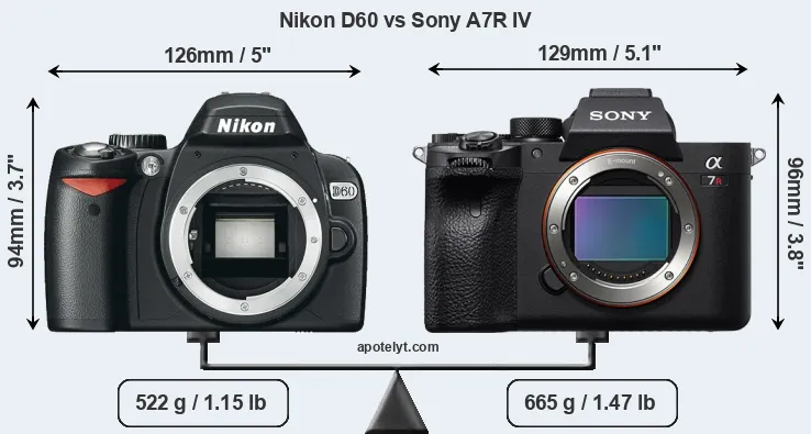 The physical size and weight of the Nikon D60 and the Sony A7R IV are illustrated in the side-by-side display below. The two cameras are presented according to their relative size. Three successive views from the front, the top, and the rear are shown. All size dimensions are rounded to the nearest millimeter.