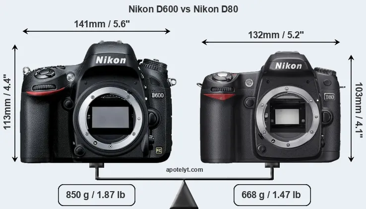 Going beyond this snapshot of core features and characteristics, what are the differences between the Nikon D600 and the Nikon D80? Which one should you buy? Read on to find out how these two cameras compare with respect to their body size, their imaging sensors, their shooting features, their input-output connections, and their reception by expert reviewers.