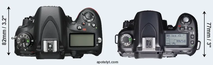 The side-by-side display below illustrates the physical size and weight of the Nikon D600 and the Nikon D80. The two cameras are presented according to their relative size. Three successive views from the front, the top, and the rear are shown. All size dimensions are rounded to the nearest millimeter.