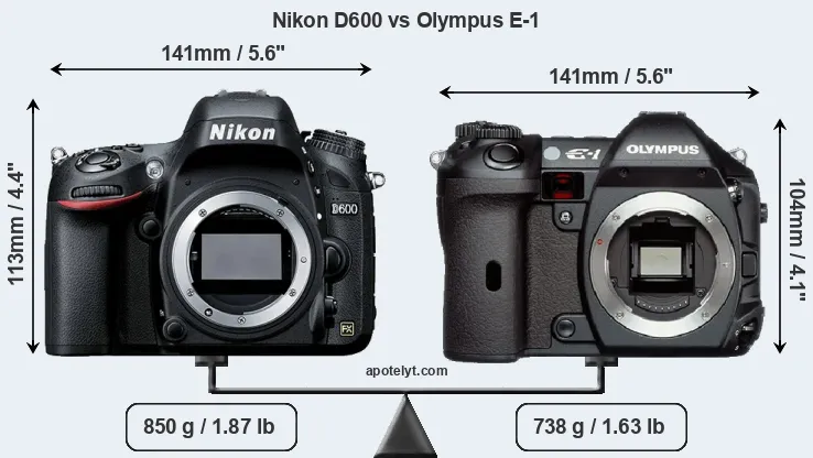 An illustration of the physical size and weight of the Nikon D600 and the Olympus E-1 is provided in the side-by-side display below. The two cameras are presented according to their relative size. Three consecutive views from the front, the top, and the rear side are shown. All width, height and depth measures are rounded to the nearest millimeter.