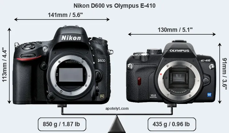 The physical size and weight of the Nikon D600 and the Olympus E-410 are illustrated in the side-by-side display below. The two cameras are presented according to their relative size. Three consecutive views from the front, the top, and the rear side are shown. All width, height and depth dimensions are rounded to the nearest millimeter.