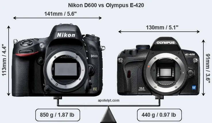 The physical size and weight of the Nikon D600 and the Olympus E-420 are illustrated in the side-by-side display below. The two cameras are presented according to their relative size. Three consecutive views from the front, the top, and the rear side are shown. All width, height and depth dimensions are rounded to the nearest millimeter.