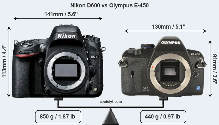 The physical size and weight of the Nikon D600 and the Olympus E-450 are illustrated in the side-by-side display below. The two cameras are presented according to their relative size. Three consecutive views from the front, the top, and the rear side are shown. All width, height and depth dimensions are rounded to the nearest millimeter.