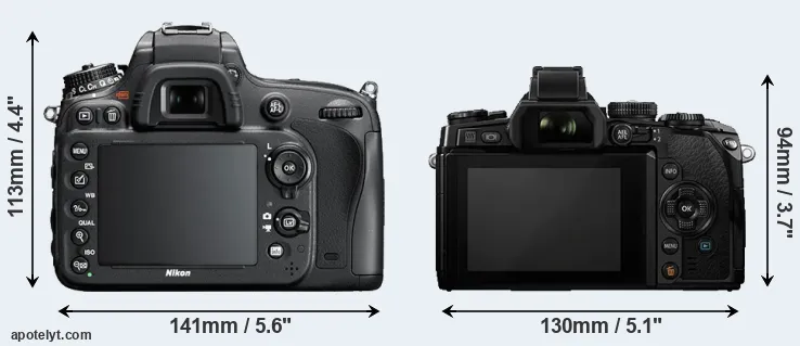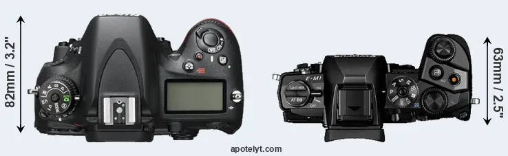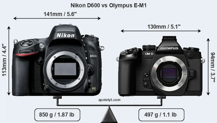 The side-by-side display below illustrates the physical size and weight of the Nikon D600 and the Olympus E-M1. The two cameras are presented according to their relative size. Three consecutive perspectives from the front, the top, and the back are available. All width, height and depth measures are rounded to the nearest millimeter.