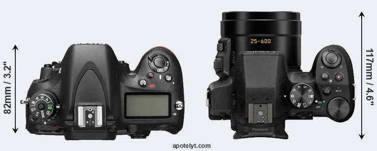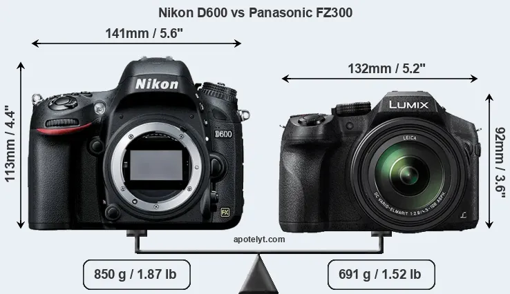 The side-by-side display below illustrates the physical size and weight of the Nikon D600 and the Panasonic FZ300. The two cameras are presented according to their relative size. Three consecutive perspectives from the front, the top, and the back are available. All width, height and depth measures are rounded to the nearest millimeter.
