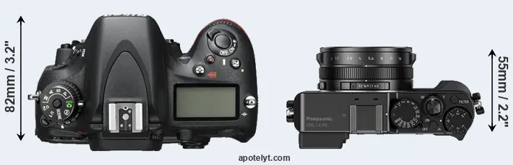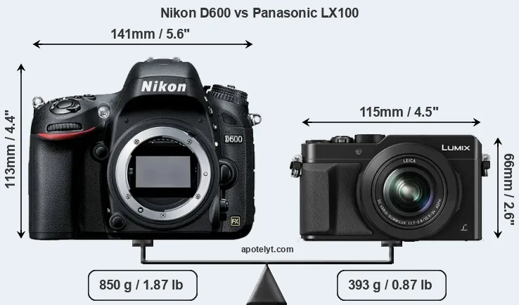 The side-by-side display below illustrates the physical size and weight of the Nikon D600 and the Panasonic LX100. The two cameras are presented according to their relative size. Three consecutive views from the front, the top, and the rear side are shown. All width, height and depth dimensions are rounded to the nearest millimeter.