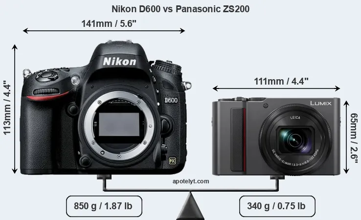 The physical size and weight of the Nikon D600 and the Panasonic ZS200 are illustrated in the side-by-side display below. The two cameras are presented according to their relative size. Three consecutive perspectives from the front, the top, and the back are available. All width, height and depth measures are rounded to the nearest millimeter.