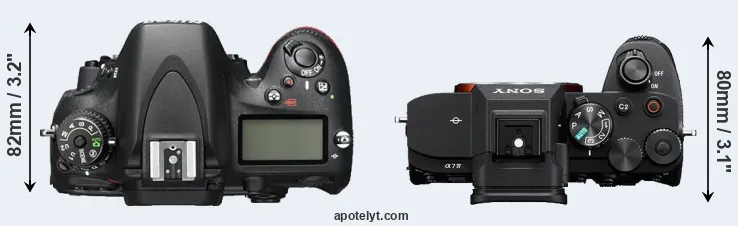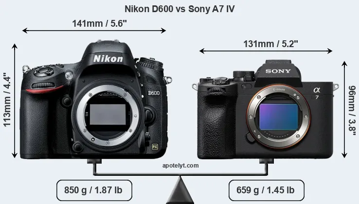 An illustration of the physical size and weight of the Nikon D600 and the Sony A7 IV is provided in the side-by-side display below. The two cameras are presented according to their relative size. Three consecutive views from the front, the top, and the rear side are shown. All width, height and depth measures are rounded to the nearest millimeter.