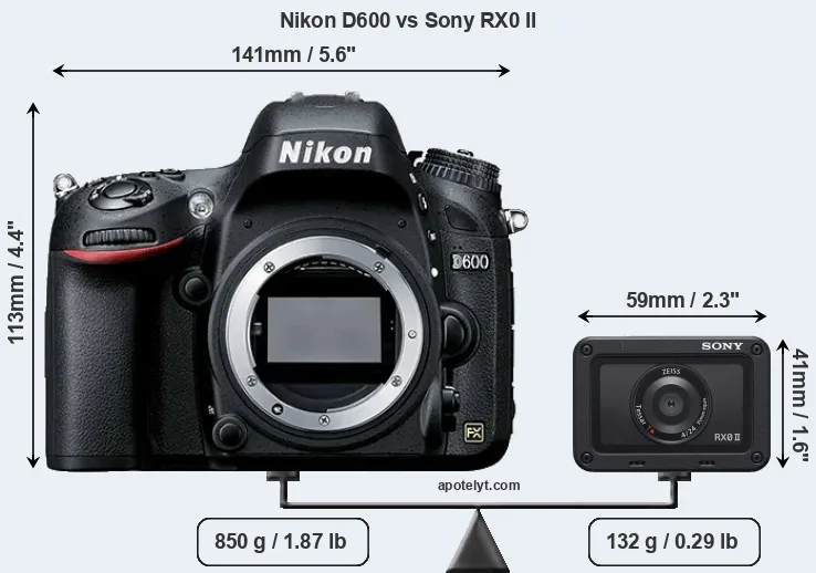 The physical size and weight of the Nikon D600 and the Sony RX0 II are illustrated in the side-by-side display below. The two cameras are presented according to their relative size. Three consecutive views from the front, the top, and the rear side are shown. All width, height and depth measures are rounded to the nearest millimeter.