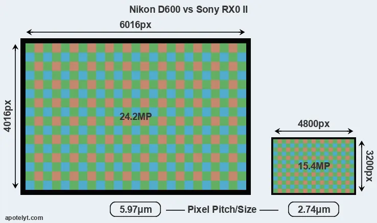 With 24.2MP, the D600 offers a higher resolution than the RX0 II (15.4MP), but the D600 nevertheless has larger individual pixels (pixel pitch of 5.97μm versus 2.74μm for the RX0 II) due to its larger sensor. However, the RX0 II is a much more recent model (by 6 years and 6 months) than the D600, and its sensor will have benefitted from technological advances during this time that further enhance the light gathering capacity of its pixels.