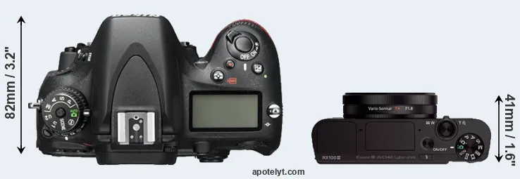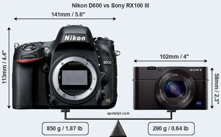 The physical size and weight of the Nikon D600 and the Sony RX100 III are illustrated in the side-by-side display below. The two cameras are presented according to their relative size. Three consecutive perspectives from the front, the top, and the back are available. All width, height and depth dimensions are rounded to the nearest millimeter.