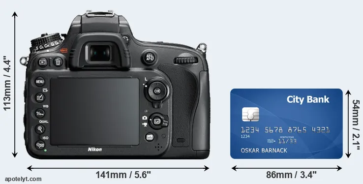 The physical dimensions of the Nikon D610 relative to a credit card are illustrated in the side-by-side display below. Three consecutive views from the front, the top, and the rear side are shown. All size dimensions are rounded to the nearest millimeter.