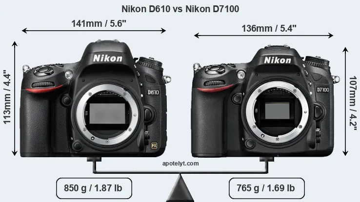 An illustration of the physical size and weight of the Nikon D610 and the Nikon D7100 is provided in the side-by-side display below. The two cameras are presented according to their relative size. Three consecutive perspectives from the front, the top, and the back are available. All width, height and depth measures are rounded to the nearest millimeter.