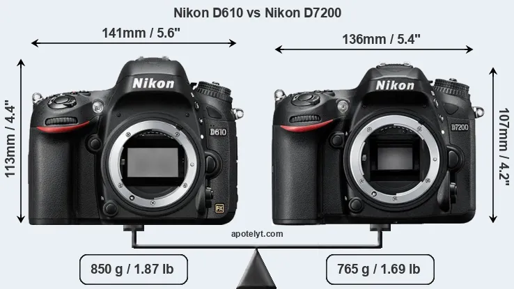 An illustration of the physical size and weight of the Nikon D610 and the Nikon D7200 is provided in the side-by-side display below. The two cameras are presented according to their relative size. Three consecutive perspectives from the front, the top, and the back are available. All width, height and depth measures are rounded to the nearest millimeter.