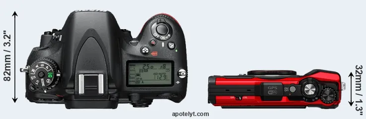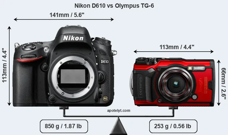 The physical size and weight of the Nikon D610 and the Olympus TG-6 are illustrated in the side-by-side display below. The two cameras are presented according to their relative size. Three successive views from the front, the top, and the rear are shown. All width, height and depth measures are rounded to the nearest millimeter.