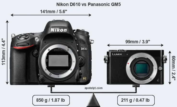 An illustration of the physical size and weight of the Nikon D610 and the Panasonic GM5 is provided in the side-by-side display below. The two cameras are presented according to their relative size. Three consecutive perspectives from the front, the top, and the back are available. All width, height and depth measures are rounded to the nearest millimeter.