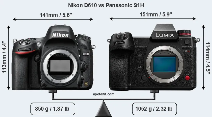 An illustration of the physical size and weight of the Nikon D610 and the Panasonic S1H is provided in the side-by-side display below. The two cameras are presented according to their relative size. Three consecutive perspectives from the front, the top, and the back are available. All size dimensions are rounded to the nearest millimeter.