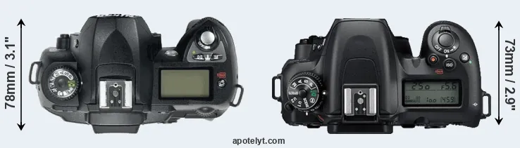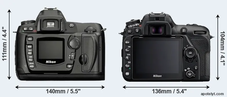 The physical size and weight of the Nikon D70 and the Nikon D7500 are illustrated in the side-by-side display below. The two cameras are presented according to their relative size. Three consecutive perspectives from the front, the top, and the back are available. All width, height and depth measures are rounded to the nearest millimeter.