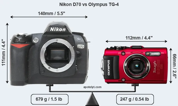 The side-by-side display below illustrates the physical size and weight of the Nikon D70 and the Olympus TG-4. The two cameras are presented according to their relative size. Three consecutive views from the front, the top, and the rear side are shown. All width, height and depth dimensions are rounded to the nearest millimeter.