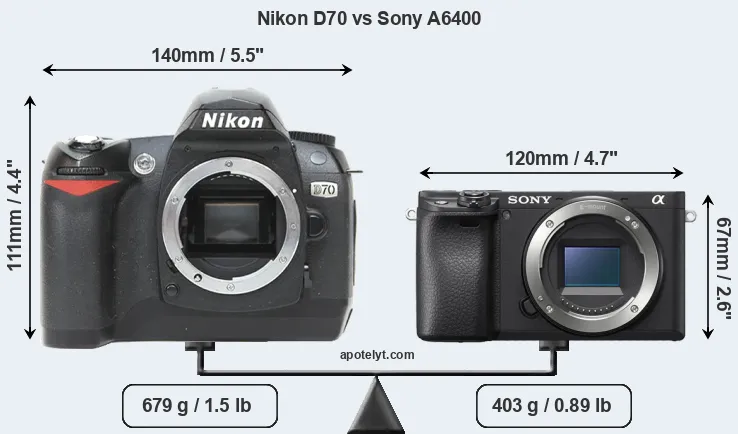 If the front view area (width x height) of the cameras is taken as an aggregate measure of their size, the Sony A6400 is considerably smaller (48 percent) than the Nikon D70. Moreover, the A6400 is substantially lighter (41 percent) than the D70. It is noteworthy in this context that the A6400 is splash and dust-proof, while the D70 does not feature any corresponding weather-sealing.