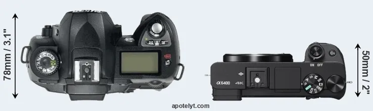 The side-by-side display below illustrates the physical size and weight of the Nikon D70 and the Sony A6400. The two cameras are presented according to their relative size. Three successive views from the front, the top, and the rear are shown. All size dimensions are rounded to the nearest millimeter.