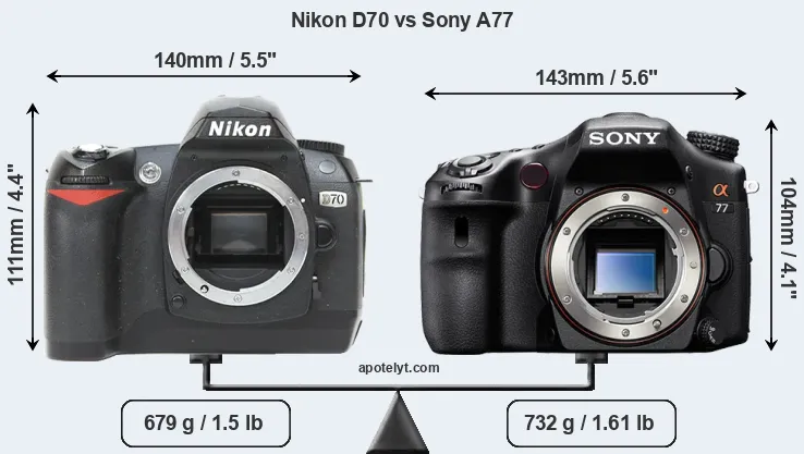 An illustration of the physical size and weight of the Nikon D70 and the Sony A77 is provided in the side-by-side display below. The two cameras are presented according to their relative size. Three consecutive perspectives from the front, the top, and the back are available. All width, height and depth measures are rounded to the nearest millimeter.