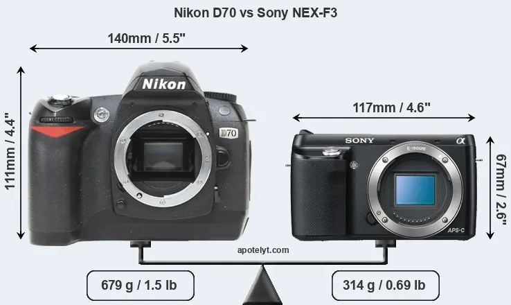 The side-by-side display below illustrates the physical size and weight of the Nikon D70 and the Sony NEX-F3. The two cameras are presented according to their relative size. Three consecutive perspectives from the front, the top, and the back are available. All size dimensions are rounded to the nearest millimeter.