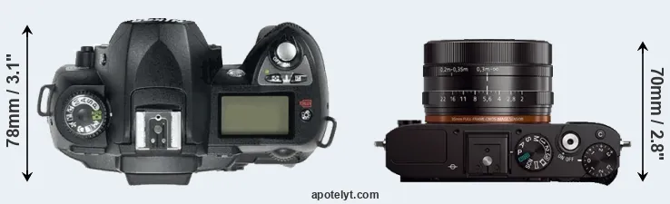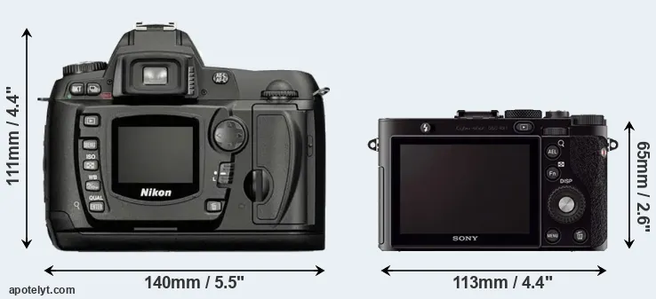 The side-by-side display below illustrates the physical size and weight of the Nikon D70 and the Sony RX1. The two cameras are presented according to their relative size. Three consecutive perspectives from the front, the top, and the back are available. All width, height and depth measures are rounded to the nearest millimeter.