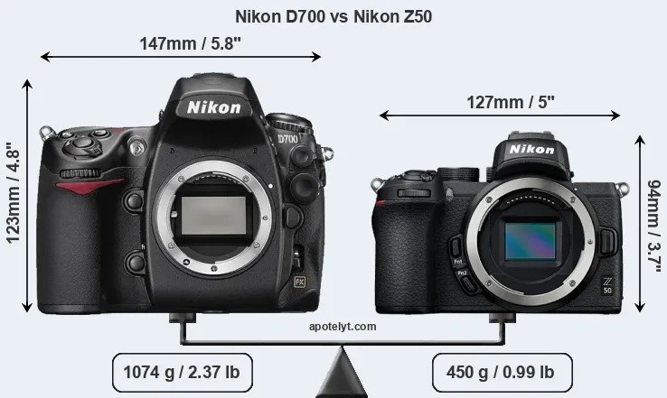 The physical size and weight of the Nikon D700 and the Nikon Z50 are illustrated in the side-by-side display below. The two cameras are presented according to their relative size. Three successive views from the front, the top, and the rear are shown. All width, height and depth measures are rounded to the nearest millimeter.