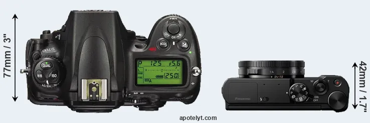 The side-by-side display below illustrates the physical size and weight of the Nikon D700 and the Panasonic LX15. The two cameras are presented according to their relative size. Three successive views from the front, the top, and the rear are shown. All size dimensions are rounded to the nearest millimeter.