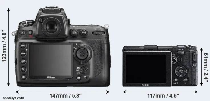 An illustration of the physical size and weight of the Nikon D700 and the Ricoh GR is provided in the side-by-side display below. The two cameras are presented according to their relative size. Three consecutive views from the front, the top, and the rear side are shown. All width, height and depth measures are rounded to the nearest millimeter.