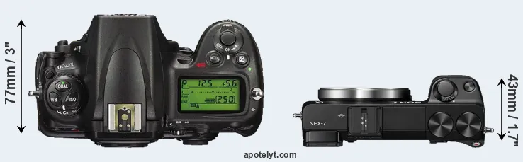 The side-by-side display below illustrates the physical size and weight of the Nikon D700 and the Sony NEX-7. The two cameras are presented according to their relative size. Three consecutive perspectives from the front, the top, and the back are available. All width, height and depth measures are rounded to the nearest millimeter.