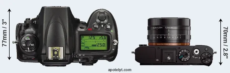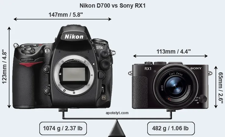 An illustration of the physical size and weight of the Nikon D700 and the Sony RX1 is provided in the side-by-side display below. The two cameras are presented according to their relative size. Three consecutive views from the front, the top, and the rear side are shown. All size dimensions are rounded to the nearest millimeter.