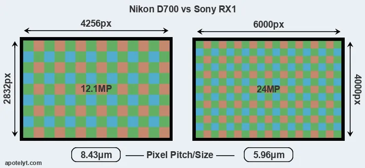 Despite having a slightly smaller sensor, the RX1 offers a higher resolution of 24 megapixels, compared with 12.1 MP of the D700. This megapixels advantage comes at the cost of a higher pixel density and a smaller size of the individual pixel (with a pixel pitch of 5.96μm versus 8.43μm for the D700). However, it should be noted that the RX1 is much more recent (by 4 years and 2 months) than the D700, and its sensor will have benefitted from technological advances during this time that make it possible to gather light more efficiently.