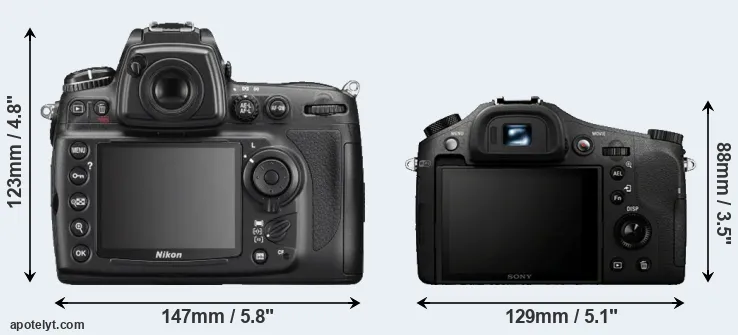 The physical size and weight of the Nikon D700 and the Sony RX10 are illustrated in the side-by-side display below. The two cameras are presented according to their relative size. Three consecutive views from the front, the top, and the rear side are shown. All width, height and depth measures are rounded to the nearest millimeter.